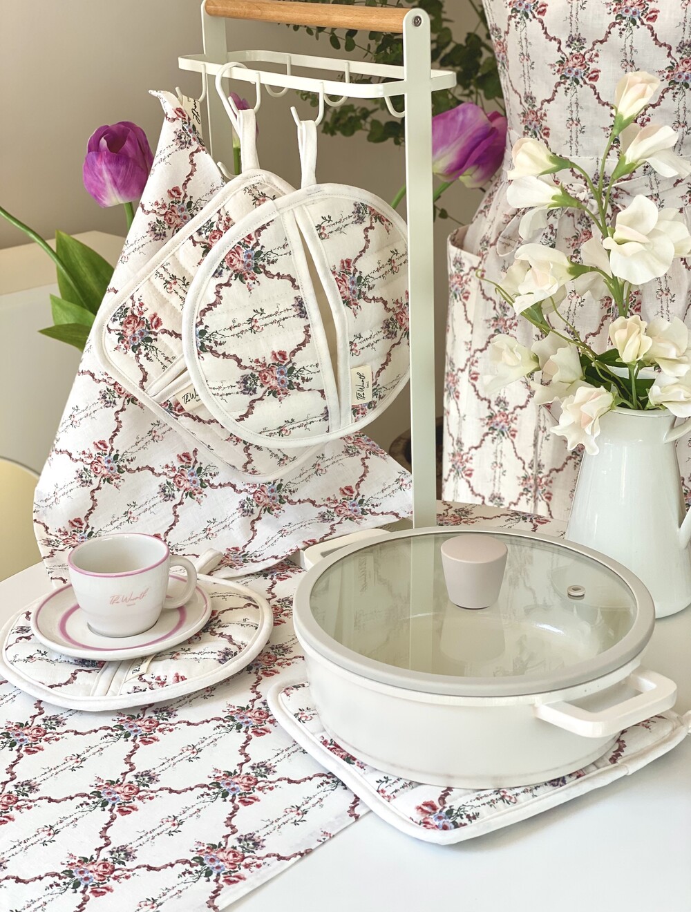 세트 상품인 부띠크 앞치마와 린넨매트, 룸슬리퍼를